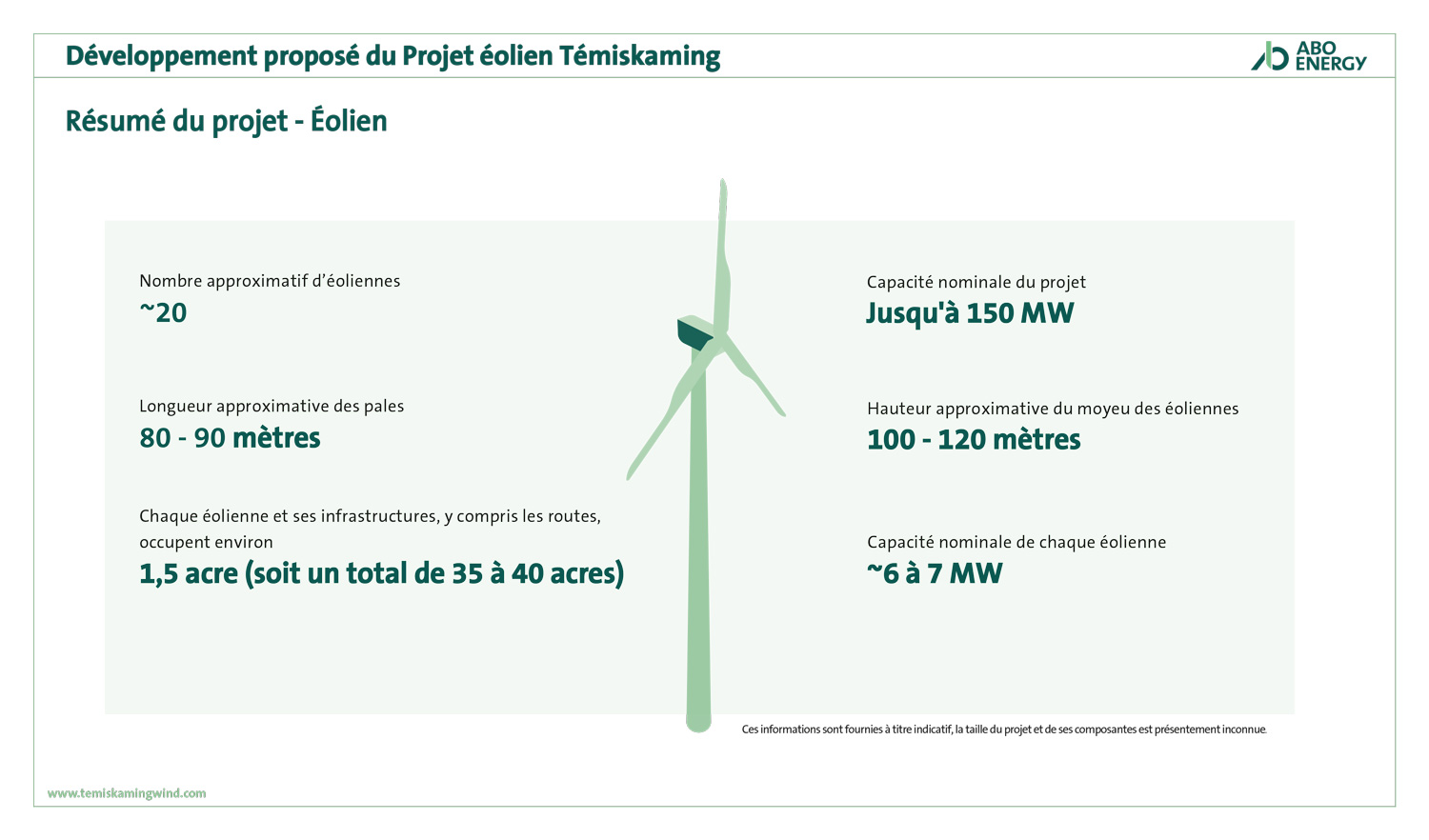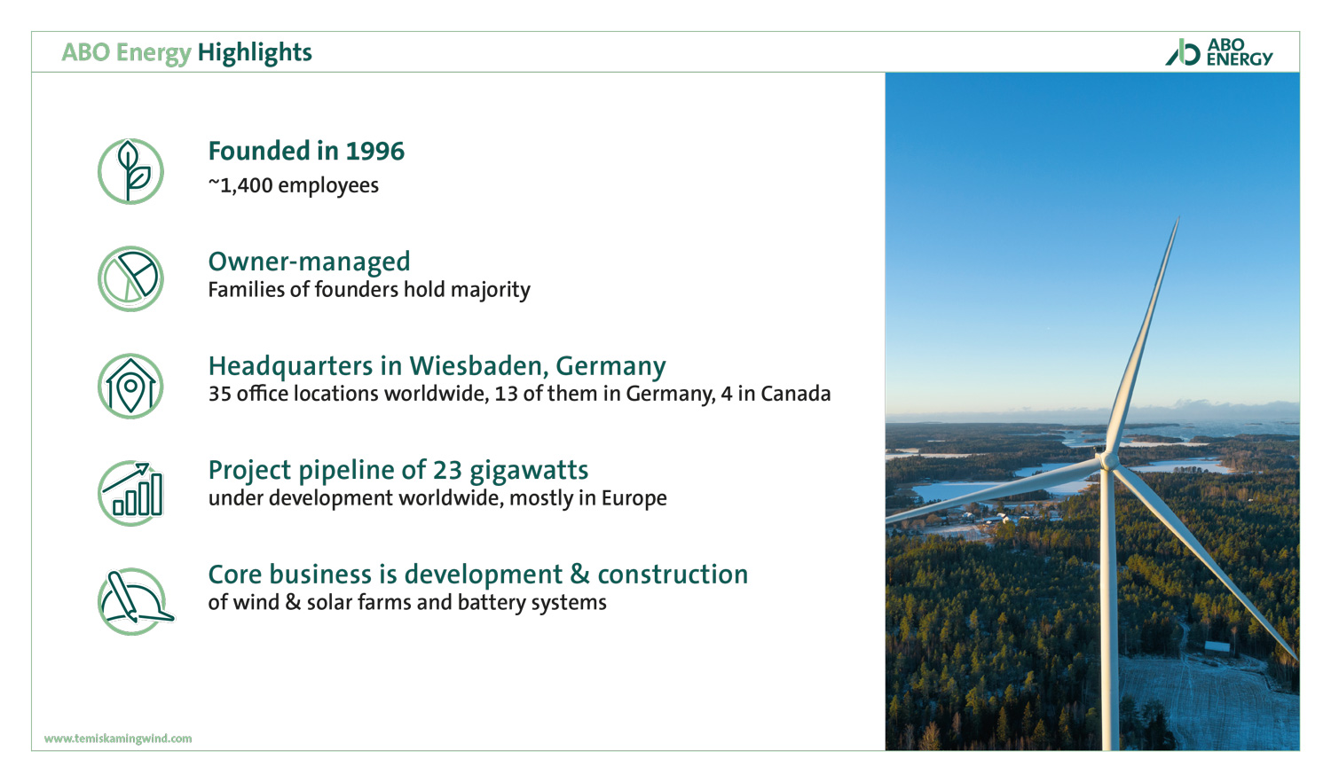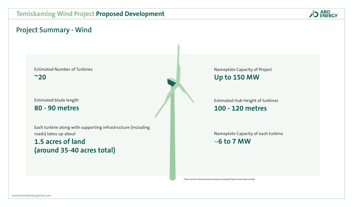 ABO Energy is proposing the development of the Timiskaming Wind Project, a utility-scale wind energy project with an installed capacity of 100 to 150 megawatts (MW). The Project is designed to contribute clean, renewable energy to Ontario’s transmission grid and support provincial decarbonization goals.