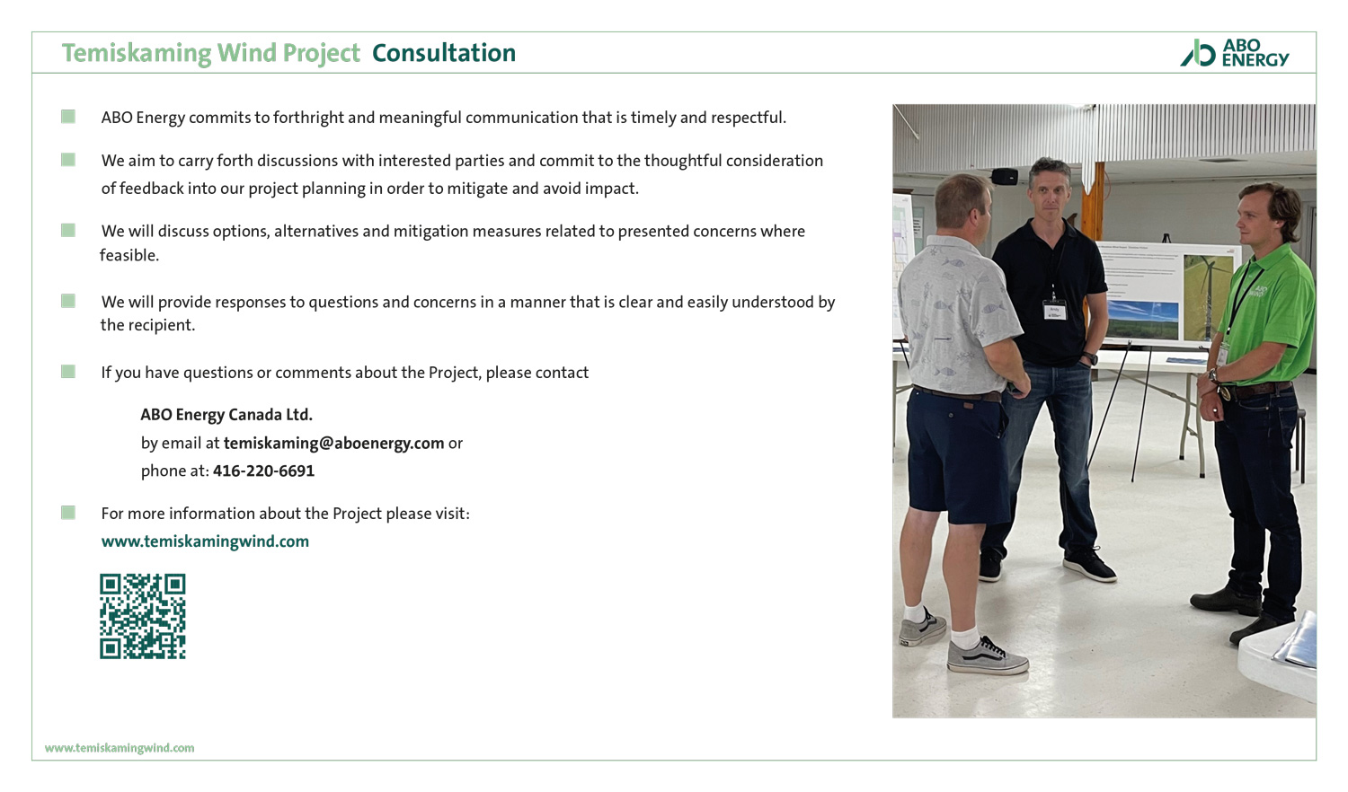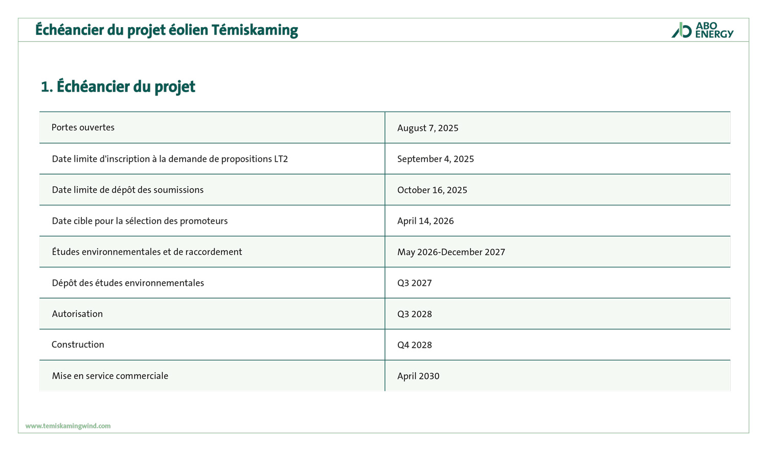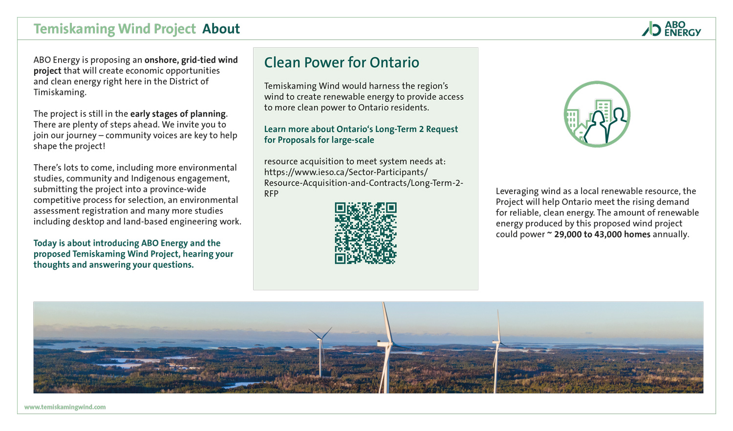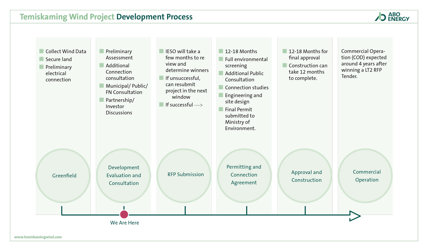 ABO Energy has decided not to proceed with submitting the Timiskaming Wind Project into the IESO Long Term 2 (LT2) Window 1, which had a submission deadline of October 16th, 2025. Instead, ABO Energy will further strengthen our project by collecting additional wind data and advancing project development. In addition, we will continue to engage the public and First Nations to build trust, disseminate accurate information and receive feedback. Our intention will be to submit into LT2 Window 2, which is tentatively scheduled for Summer 2026.