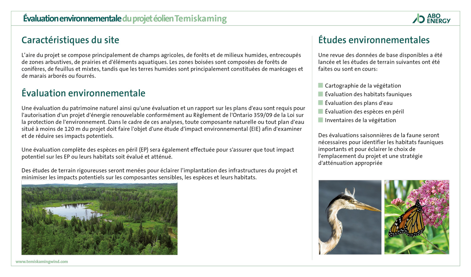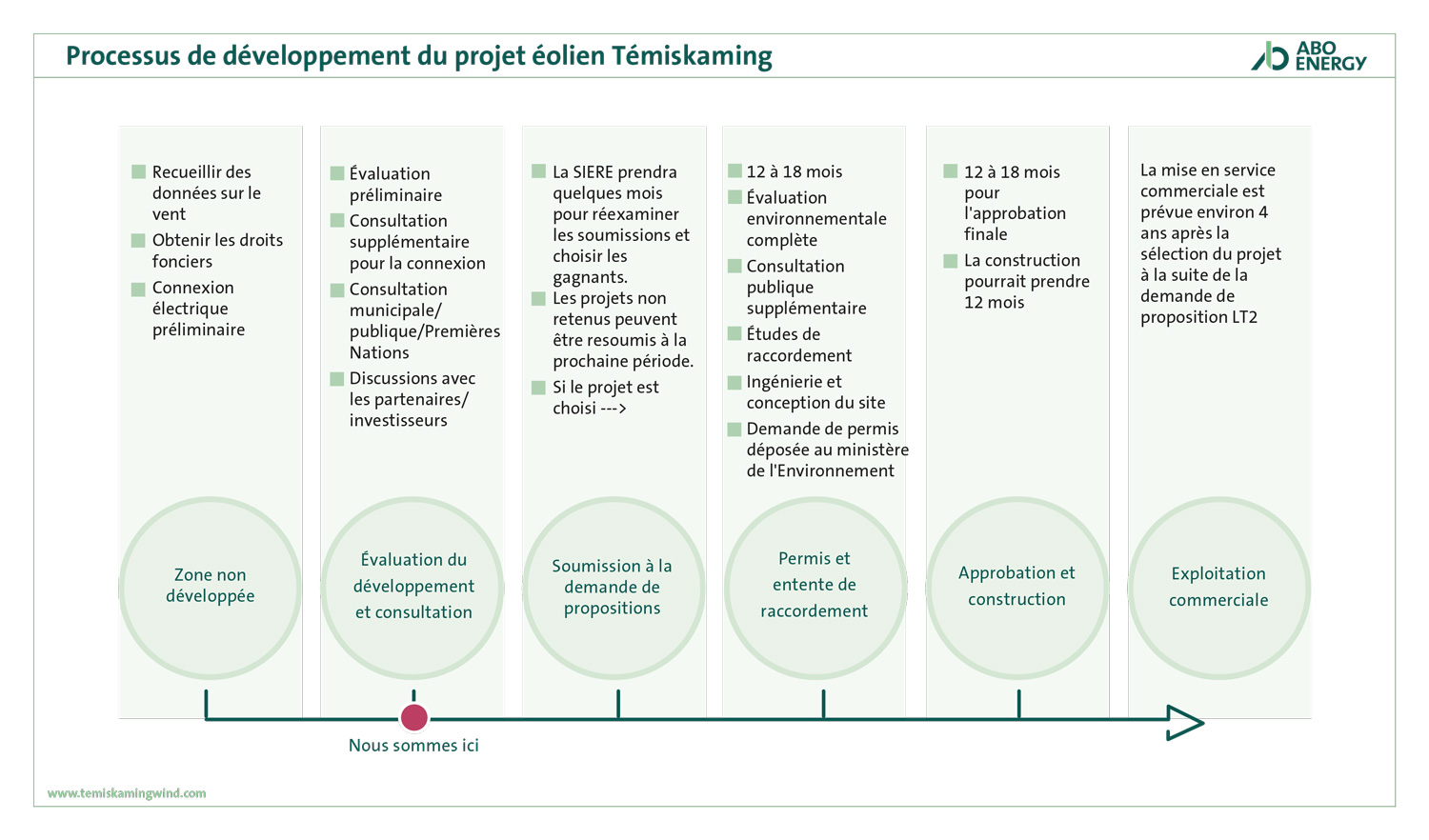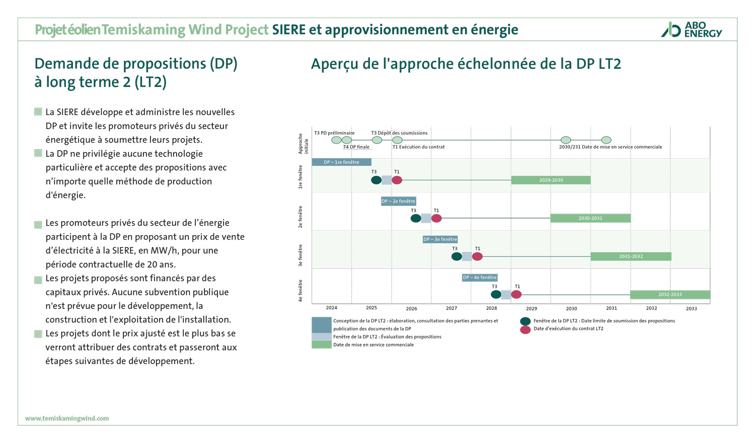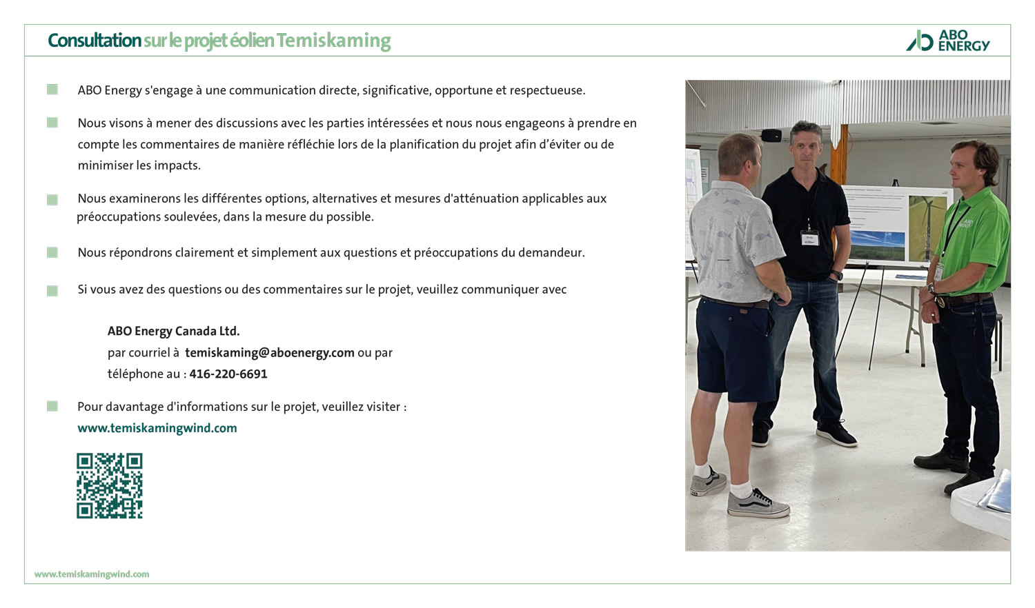 ABO Energy has decided not to proceed with submitting the Timiskaming Wind Project into the IESO Long Term 2 (LT2) Window 1, which had a submission deadline of October 16th, 2025. Instead, ABO Energy will further strengthen our project by collecting additional wind data and advancing project development. In addition, we will continue to engage the public and First Nations to build trust, disseminate accurate information and receive feedback. Our intention will be to submit into LT2 Window 2, which is tentatively scheduled for Summer 2026.