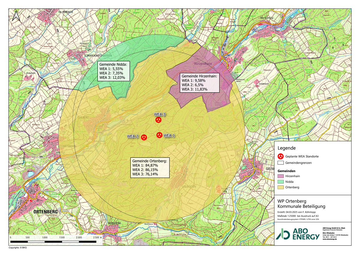 Das neue Erneuerbaren-Energien-Gesetz 2023 bietet die Möglichkeit, Kommunen im 2.500-Meter-Radius um einen Windpark entsprechend ihrem Flächenanteil mit bis zu 0,2 Cent für jede produzierte Kilowattstunde finanziell zu beteiligen. Die Kommunen entscheiden frei, wie sie das Geld einsetzen. Wenn das Projekt wie geplant realisiert wird, könnte die Gemeinde Ortenberg pro Jahr knapp 80.000 Euro, die Gemeinde Hirzenhain rund 8.500 Euro und die Gemeinde Nidda knapp 8.000 Euro erwarten.