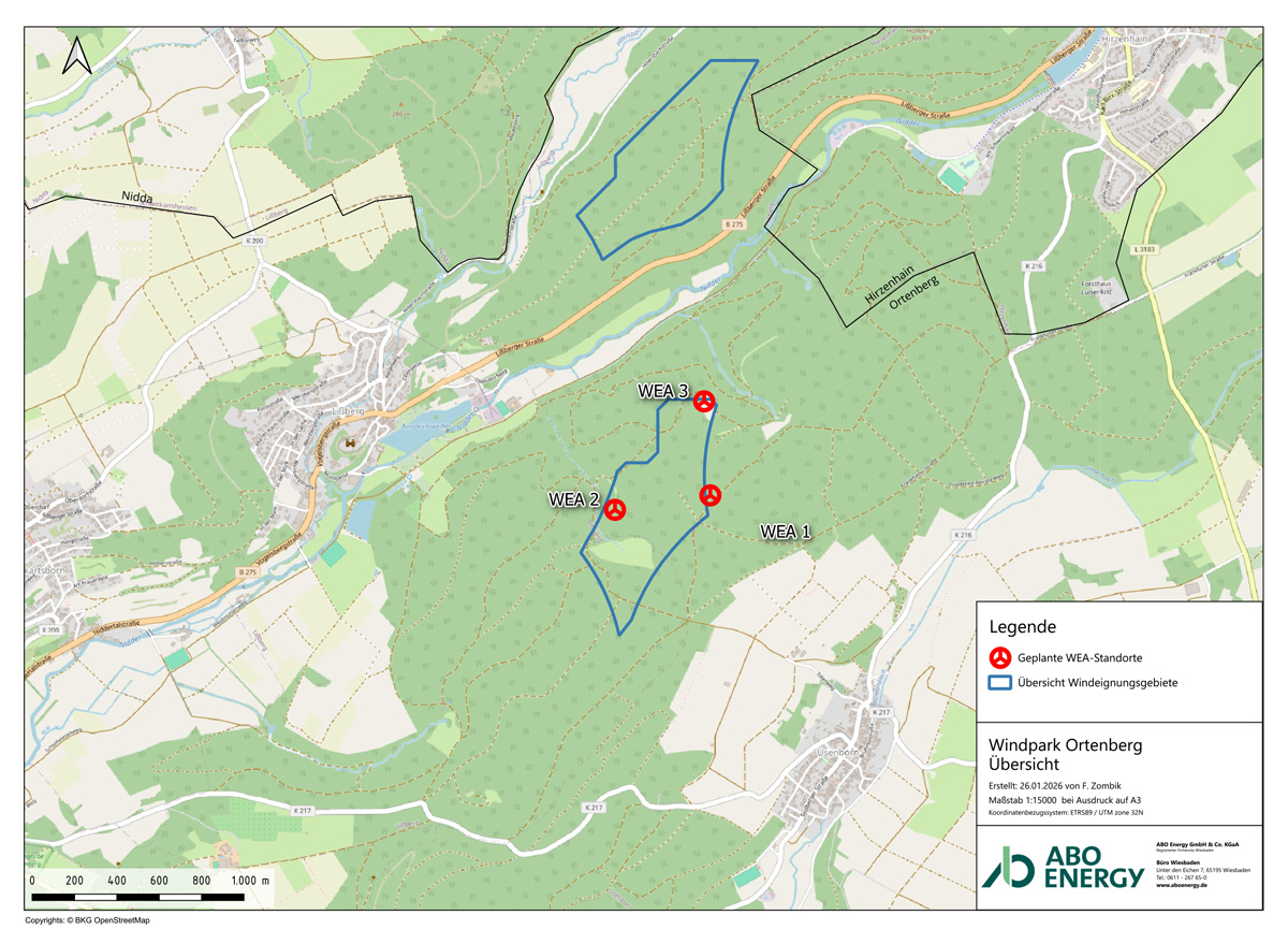ABO Energy baut derzeit im Windvorranggebiet 2-915 in Ortenberg im Wetteraukreis einen Windpark mit drei Anlagen des Typs Enercon E-175 mit einer Leistung von je sieben Megawatt. Die Anlagen werden jährlich insgesamt rund 47 Millionen Kilowattstunden sauberen Strom produzieren, so viel verbrauchen knapp 28.000 Personen in ihren Häusern und Wohnungen. Die Windkraftanlage vermeidet den Ausstoß von rund 35.000 Tonnen Kohlendioxid pro Jahr.