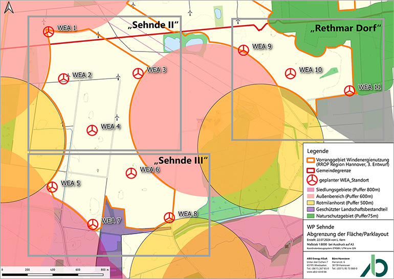 ABO Energy plant in Niedersachsen/Region Hannover, etwa 15 km östlich von der Stadt Hannover entfernt, einen Windpark mit bis zu elf Windenergieanlagen (WEA) zwischen den Städten Lehrte und Sehnde. Der geplante Windpark befindet sich im potenziellen Vorranggebiet für Windenergienutzung „Lehrte-Sehnde“, das derzeit im dritten Entwurf des Teilprogramms Windenergie des Regionalen Raumordnungsprogramms (RROP) der Region Hannover in der Stadt Sehnde und der Stadt Lehrte dargestellt wird. Die geplanten Anlagen können insgesamt jährlich rund 176 Millionen Kilowattstunden sauberen Strom erzeugen. So viel verbrauchen ungefähr 147.000 Personen in ihren Häusern und Wohnungen. Das würde den Ausstoß von knapp 132.000 Tonnen Kohlendioxid pro Jahr vermeiden.