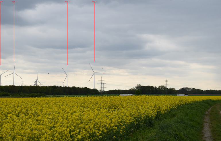 Visualisierungen sind Fotomontagen, die von verschiedenen Orten in der Umgebung aus verdeutlichen, wie der realisierte Windpark aussehen würde. Mit Hilfe eines Computerprogramms haben Experten die Windräder anhand von diversen Referenzpunkten perspektivisch korrekt in das Landschaftsbild eingefügt. So können sich Bürgerinnen und Bürger schon heute ein realistisches Bild vom geplanten Windpark machen.