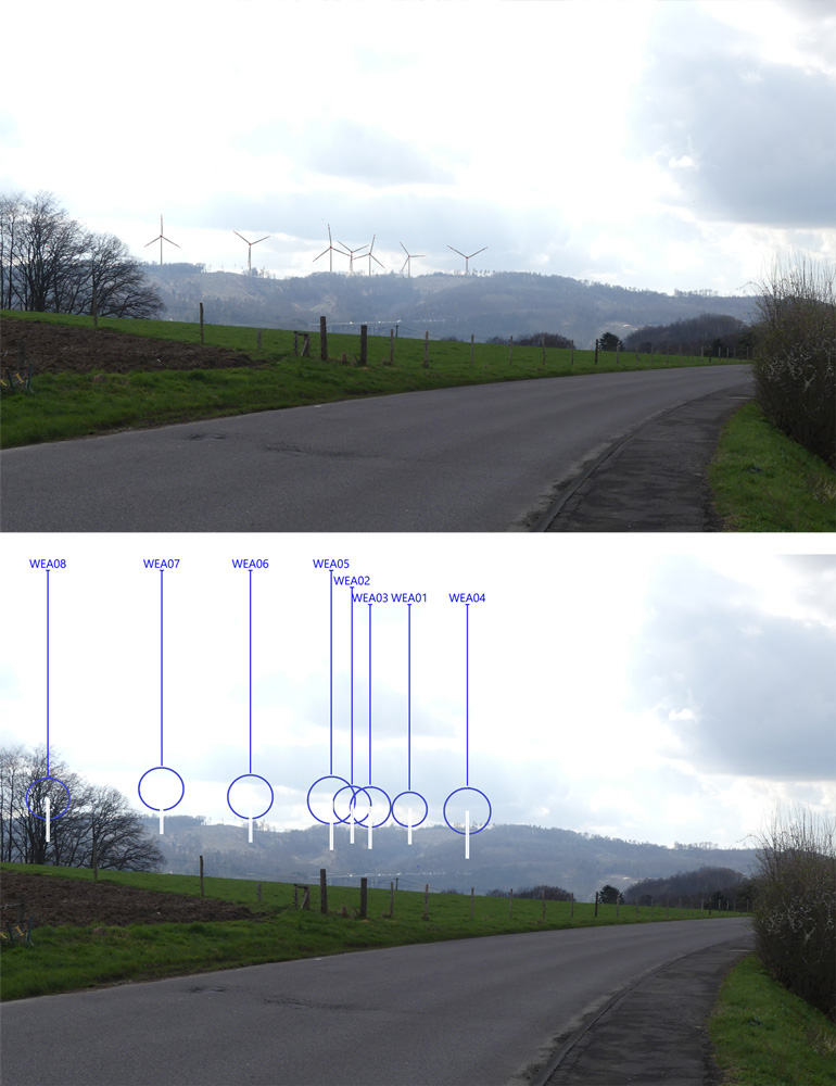 Die Rotoren der neu geplanten WEA sind in den Visualisierungen so ausgerichtet, dass sie senkrecht zur Blickachse des Betrachters stehen und damit eine maximale Sichtbarkeit haben. Dies ist in der Realität nur ab und zu der Fall, meistens steht die Anlage in einem anderen Winkel und ist damit unauffälliger.