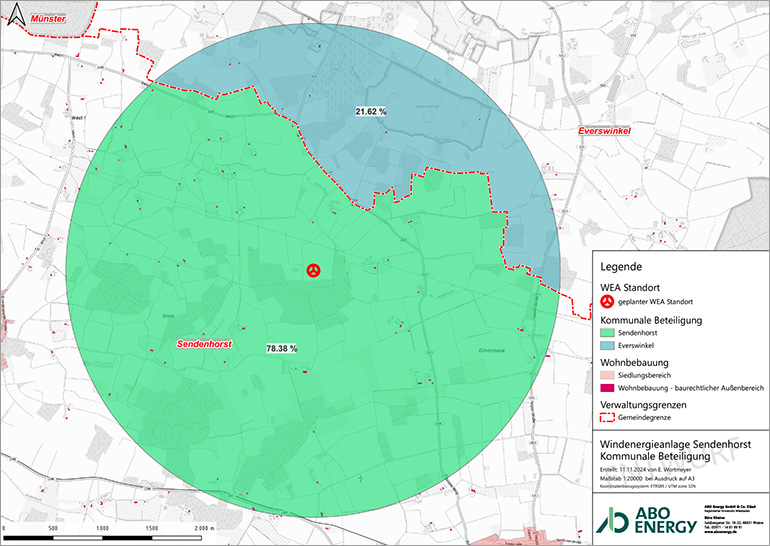 Das Erneuerbaren-Energien-Gesetz 2023 (EEG 2023) bietet die Möglichkeit, Kommunen im 2.500-Meter Radius um einen Windpark entsprechend ihres Flächenanteils mit 0,2 Cent für jede produzierte Kilowattstunde finanziell zu beteiligen. Sie entscheiden frei, wie sie das Geld einsetzen. Wenn die Windkraftanlage bei Sendenhorst realisiert wird, könnten die Gemeinde Sendenhorst rund 17.600 Euro und Everswinkel etwa 4.900 Euro erwarten.