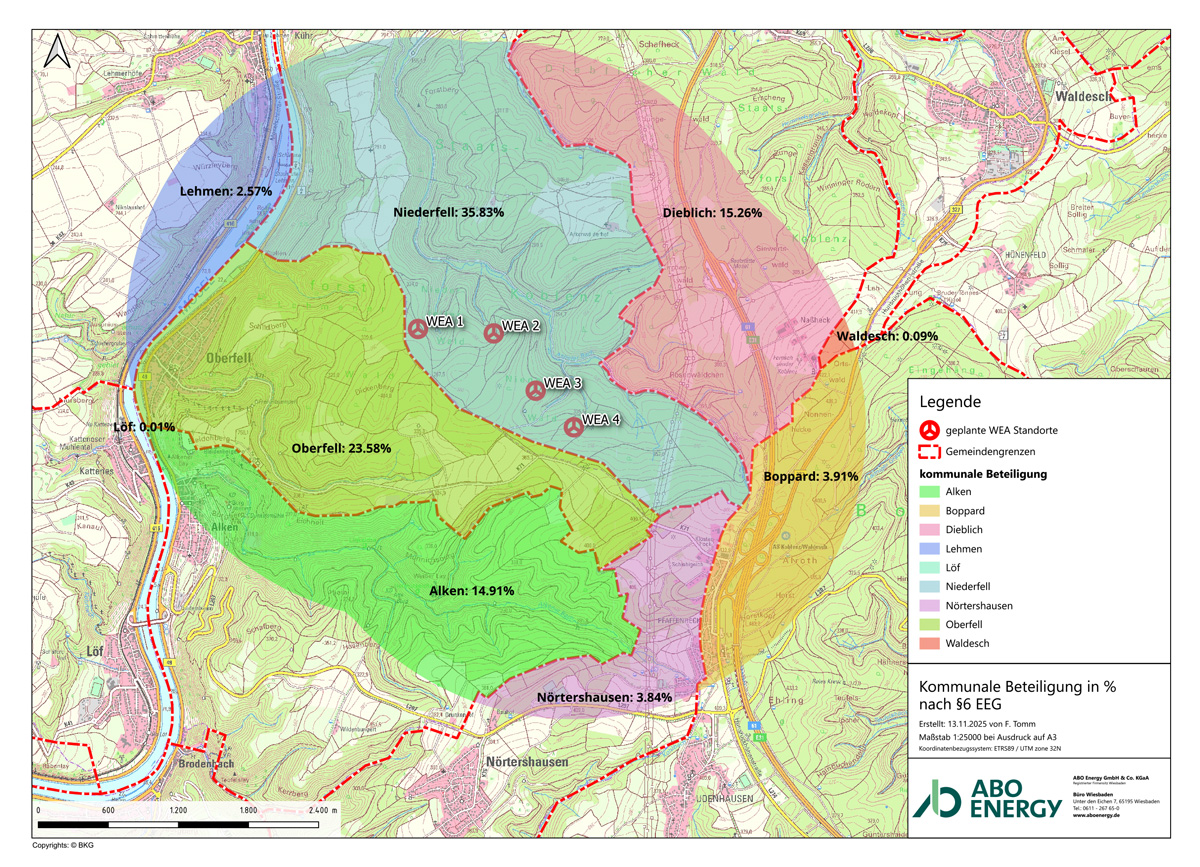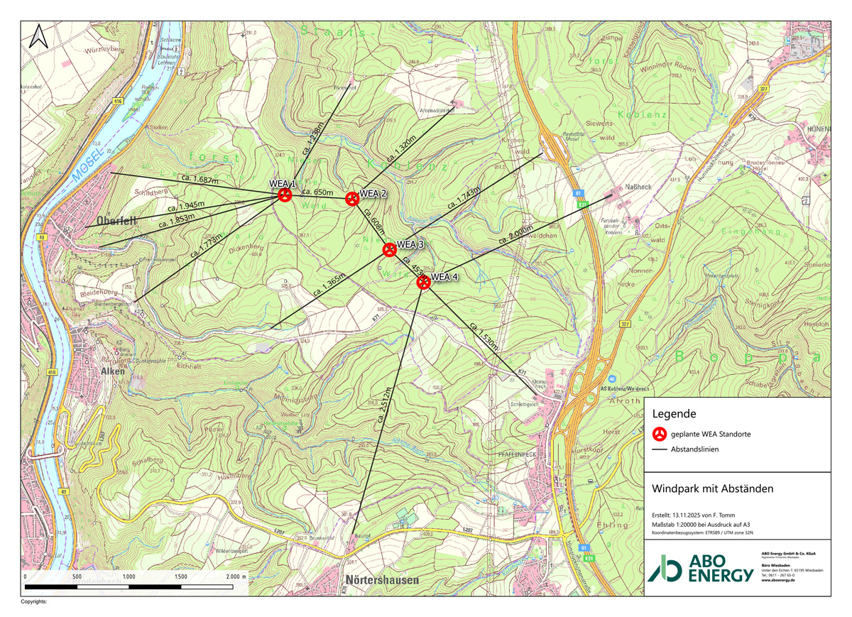 Die Kreisverwaltung Mayen-Koblenz hat ABO Energy am 30. September 2025 eine Genehmigung für den Windpark Rhein-Mosel erteilt und diese am 21. November 2025 auf ihrer Website veröffentlicht sowie über das Amtsblatt bekanntgegeben: https://www.kvmyk.de/themen/umwelt-natur/windpark-niederfell/ (bis zum 8. Dezember 2025 abrufbar)
