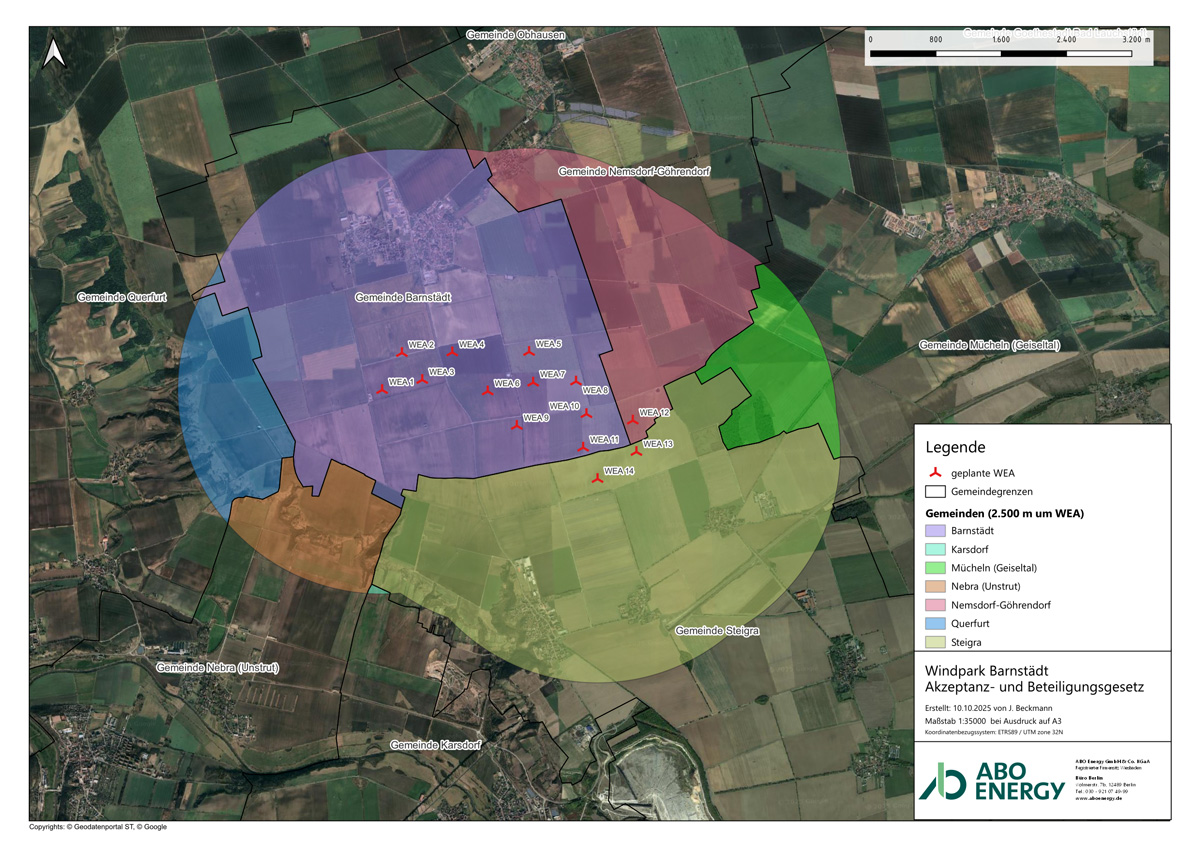 Seit dem 01.10.2025 ist in Sachsen-Anhalt das „Gesetz zur Akzeptanzsteigerung und Beteiligung beim Ausbau der erneuerbaren Energien“ in Kraft. Durch dieses Gesetz profitieren Gemeinden im Umkreis von 2.500-Meter um den Mittelpunkt einer Windenergieanlage. Die jeweilige Gemeinde erhält entsprechend ihres Flächenanteils 0,3 Cent pro Kilowattstunde für die tatsächlich erzeugte Strommenge, jedoch mindesten 5,50 € pro Kilowatt Nennleistung pro Jahr. Unter der Annahme, dass alle 14 Anlagen im Windpark Barnstädt realisiert werden, erhalten unter anderem die Gemeinde Barnstädt rund 264.000 €, die Gemeinde Nemsdorf-Göhrendorf etwa 67.000 € und die Gemeinde Steigra circa 166.000 € pro Jahr. Das wären nach aktueller Planung in Summe für alle betroffenen Gemeinden 539.000 € pro Jahr und somit 10.780.000 € bei einer Betriebsdauer von 20 Jahren. Die Gemeinden sollen diese Mittel unter anderem zur Aufwertung von Ortsbild und ortsgebundener Infrastruktur, zur Förderung kommunaler Veranstaltungen, sozialer Aktivitäten oder Einrichtungen, Kultur, Bildung oder Freizeit verwenden. Möglich ist auch die Unterstützung unternehmerischer Tätigkeiten in der Gemeinde.