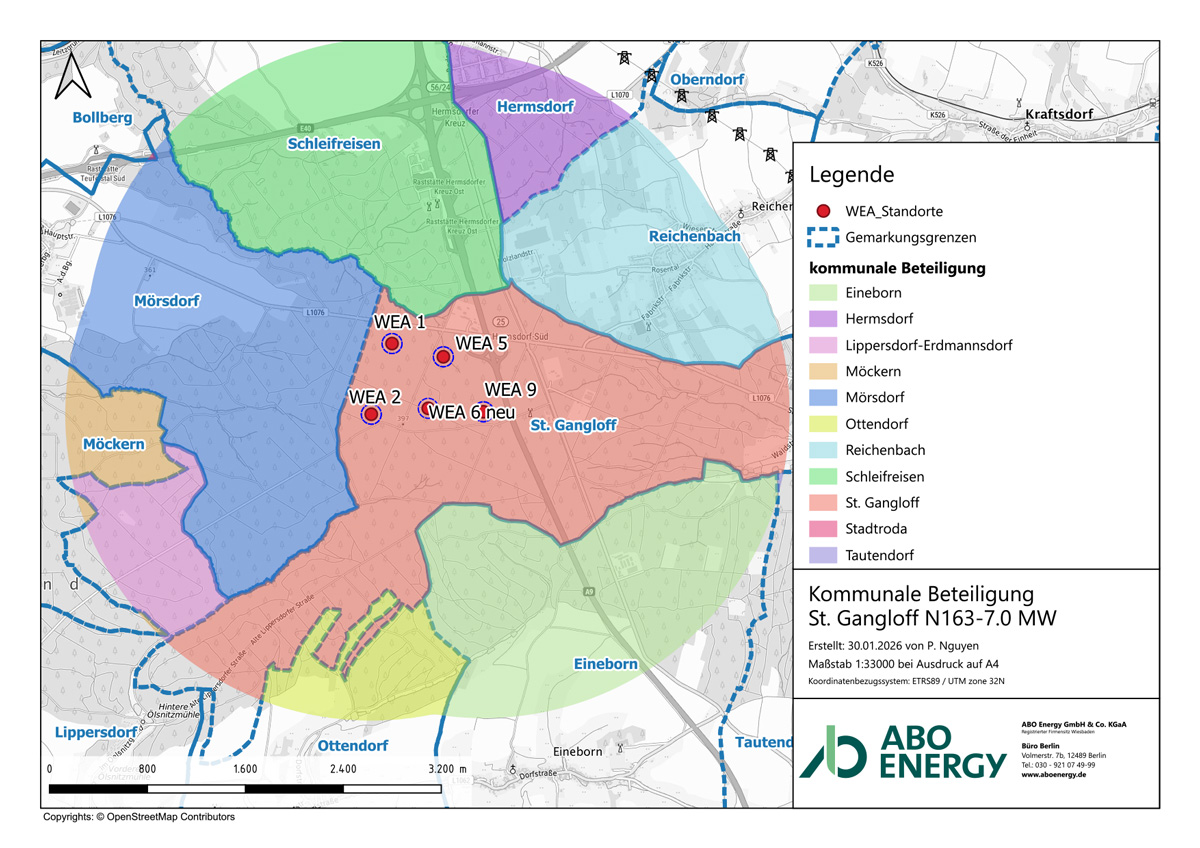 Sechseinhalb Jahre nach der ersten Infomesse in St. Gangloff möchte ABO Wind erneut mit interessierten Bürgern über die Windkraftplanungen ins Gespräch kommen. „Seitdem ist einiges passiert. Daher wollen wir alle auf den neusten Stand bringen und Fragen beantworten“, sagt Projektleiter Alex Pfeiffer. In der westlichen Teilfläche des rechtskräftig ausgewiesenen Vorranggebiets W-20-Eineborn/St. Gangloff (Regionalplan Ostthüringen 2020) sollen fünf Anlagen entstehen. Daher lädt ABO Wind zusammen mit dem Landratsamt des Saale-Holzlandkreises ein zur