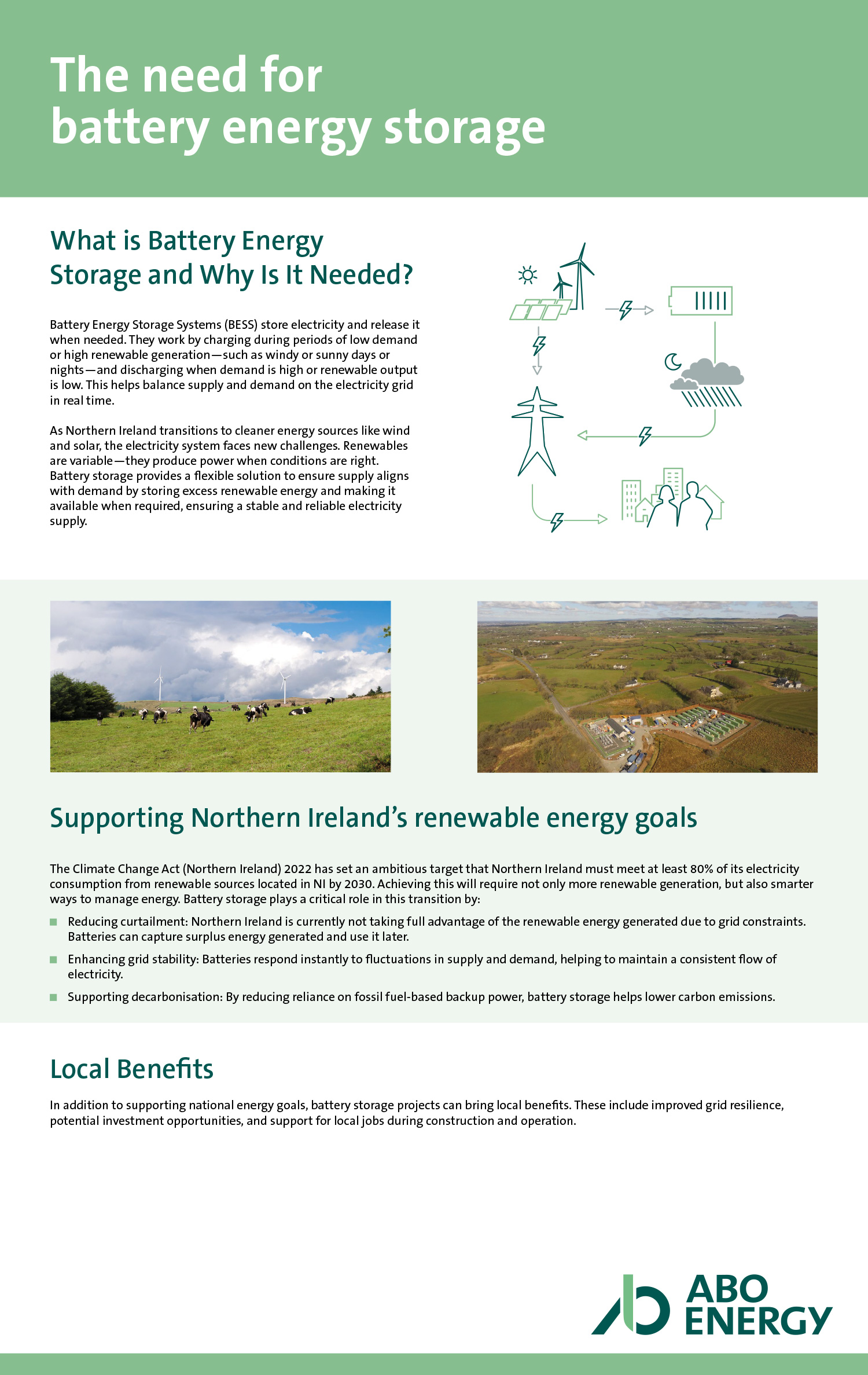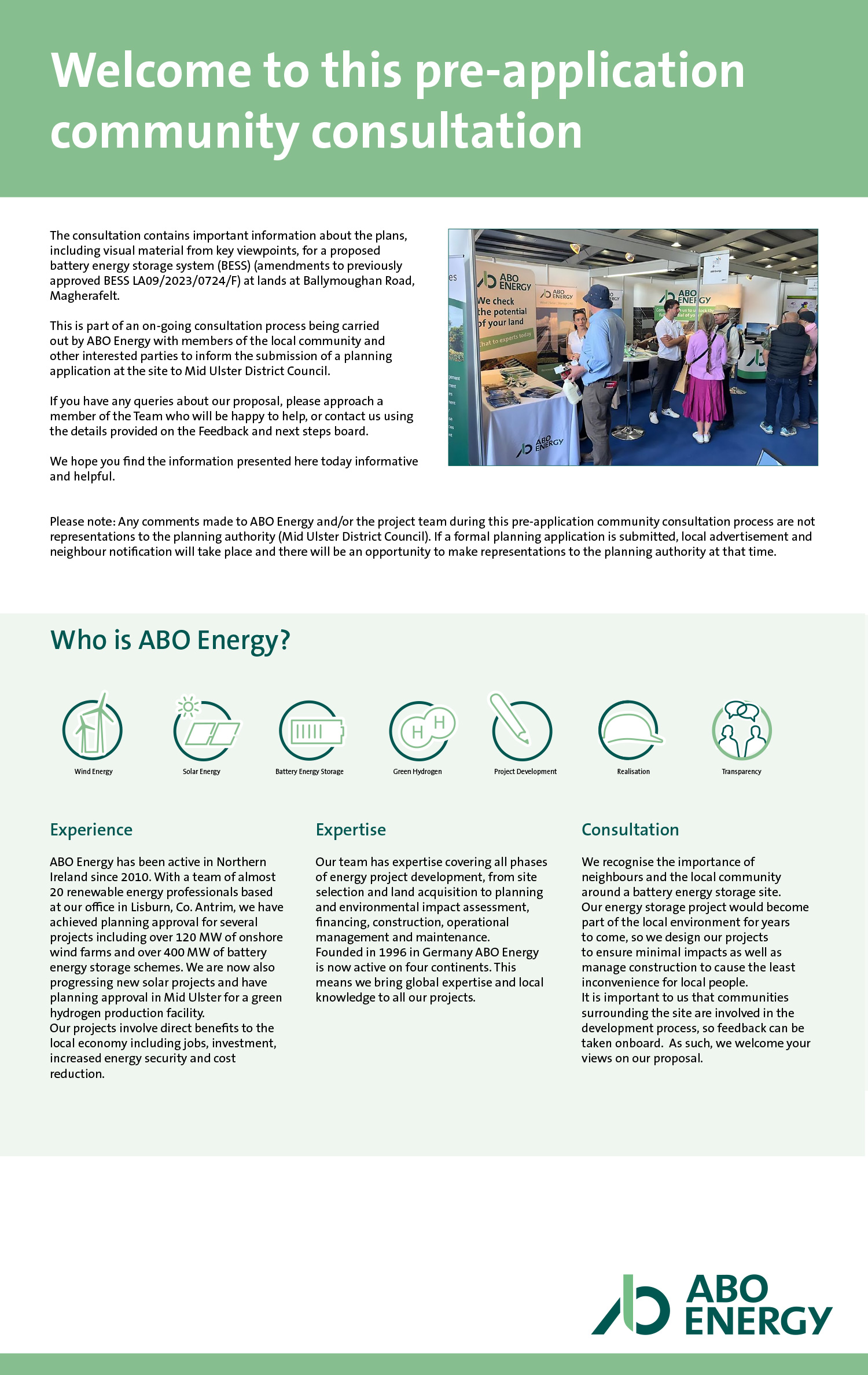 This webpage is part of an on-going consultation process being carried out by ABO Energy with members of the local community and other interested parties to inform the submission of a planning application for the Magherafelt BESS.