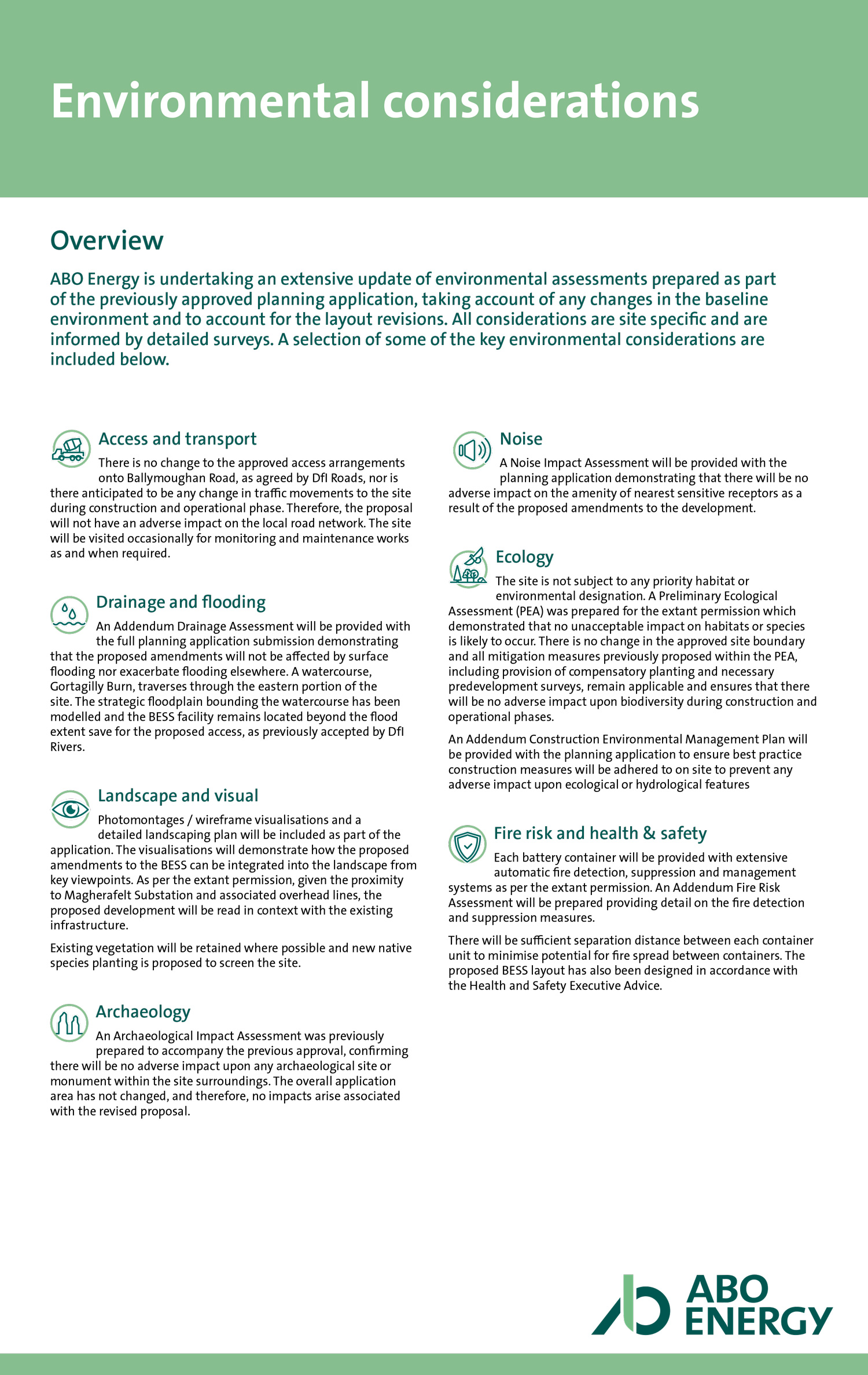 ABO Energy is undertaking extensive environmental assessments as part of its preparation of a planning application for the proposed Magherafelt BESS. A selection of some of the key environmental considerations are included below: