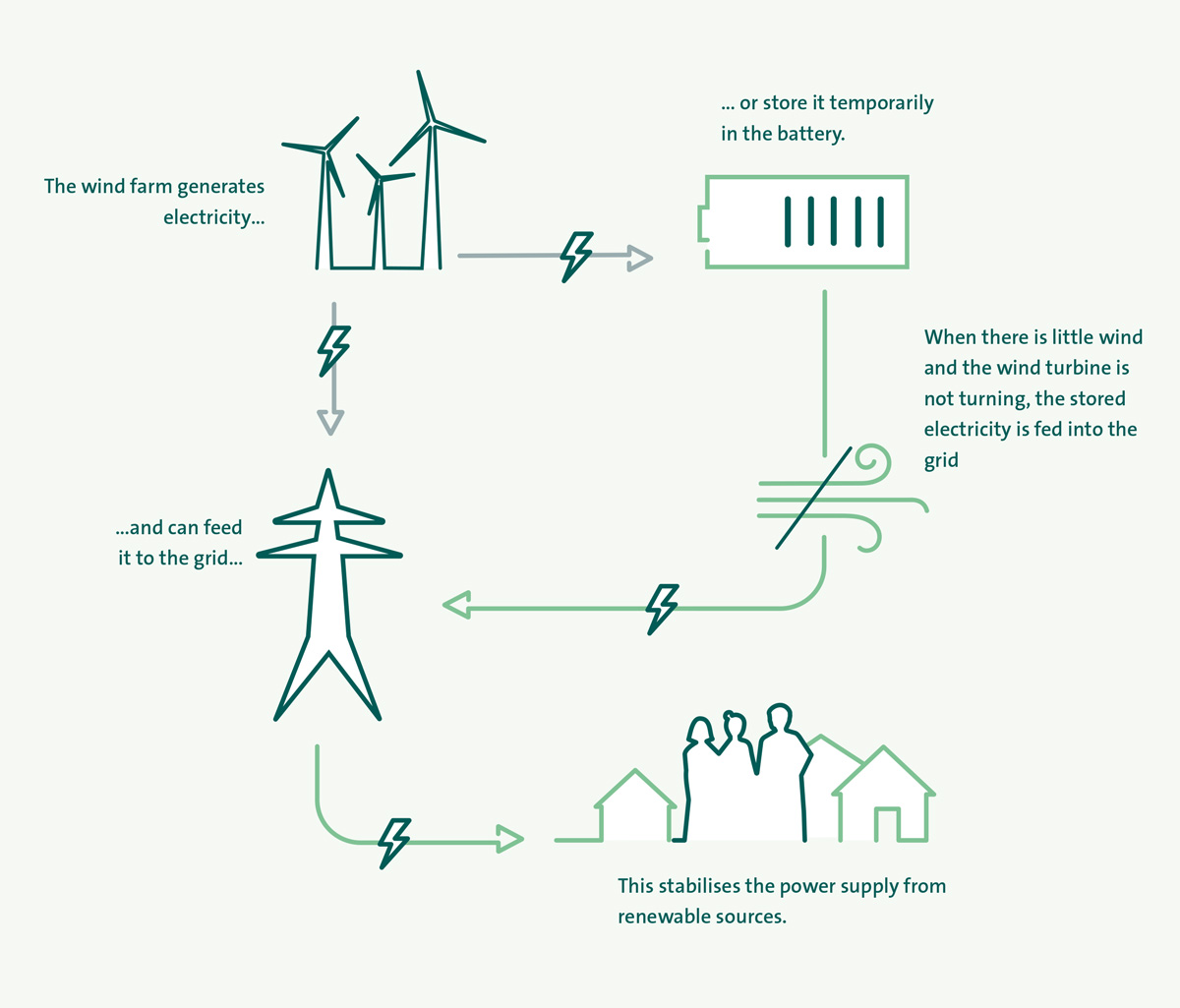 The Meenakeeran wind farm and battery energy storage project is using an approach called ‘co-location’ of generation and storage on the same site. This means when demand is high, electricity can be produced by the wind farm and fed directly to the grid, and when demand is low it can be stored onsite before being released to the grid when required.