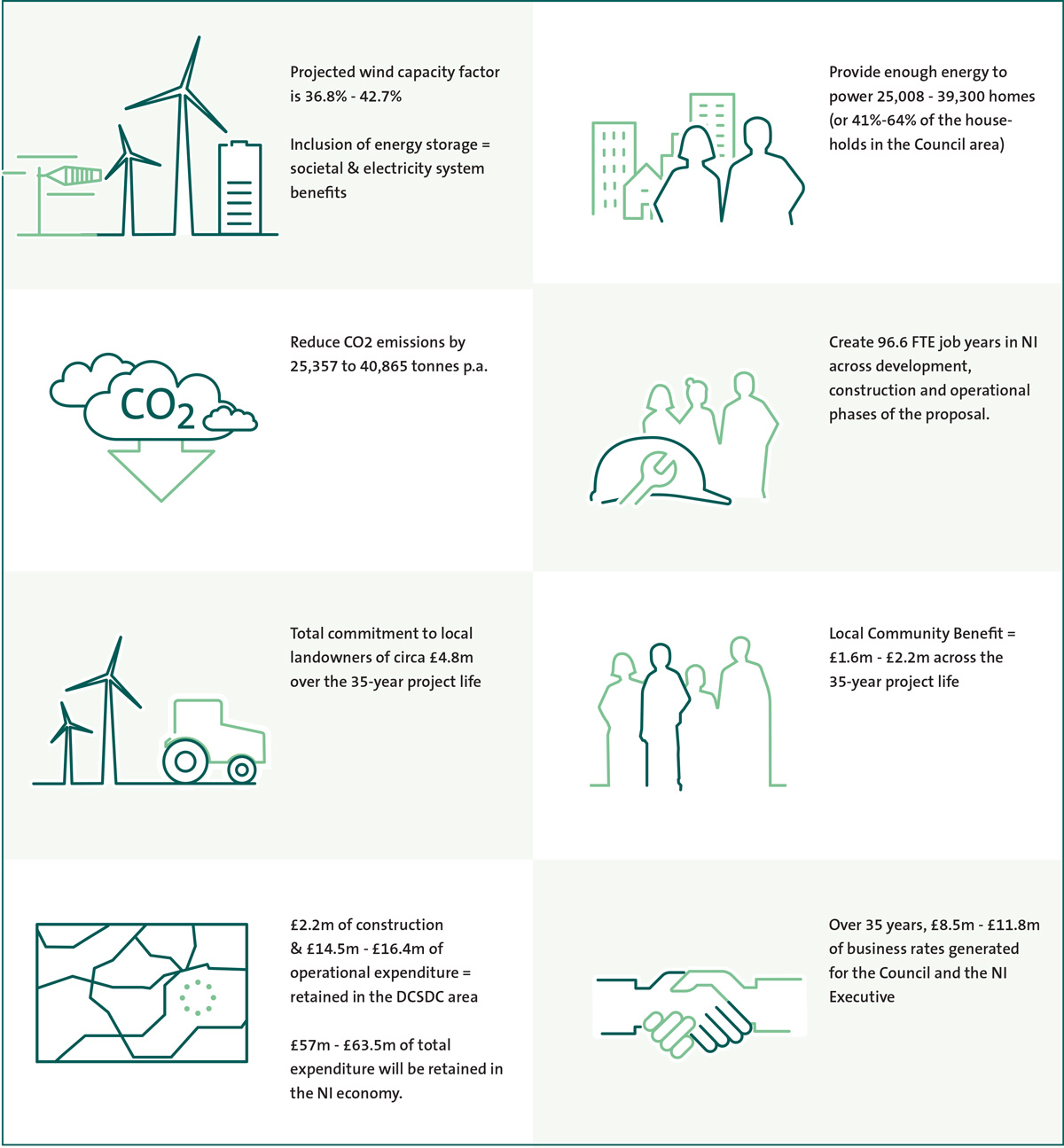 ABO Energy NI commissioned Cogent Management Consulting LLP to articulate and quantify the predicted monetary and non-monetary impacts (at a national, regional and local level) that may be attributable to the development of Meenakeeran Wind Farm. Please note: This excludes benefits associated with the Battery Energy Storage System. The development, if permitted, would represent a significant investment in the local economy, as illustrated below.